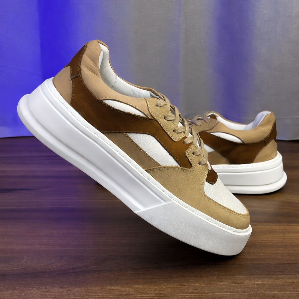 Tênis Masculino Couro Tricolor Branco Bege Marrom