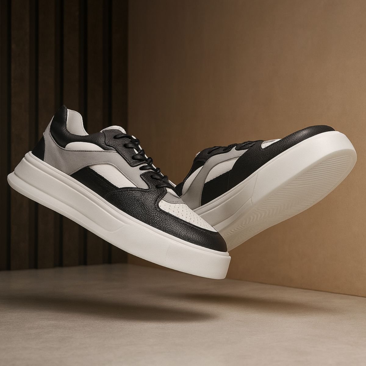 Tênis Masculino Couro Tricolor Branco Preto e Cinza